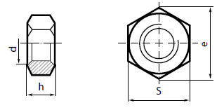 d - номинальный диаметр резьбы, мм h - высота гайки, мм S - размер под ключ, мм e - диаметр описанной окружности, не менее, мм Шаг резьбы, мм Масса 1000 шт., кг Кол-во шт. в кг.